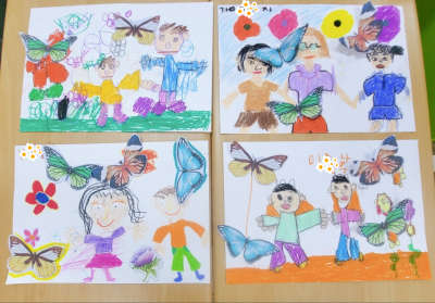 오늘 우리 아이들이 사람, 나비, 꽃 모양을 그리고 색칠해서 멋진 작품을 만들었어요. 오늘의 활동을 들어보는 초중통합반 친구들
