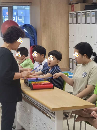공명실로폰으로 치료사와 한음씩 교대로 연주하고 1마디 혹은 2마디를 듣고 따라친다